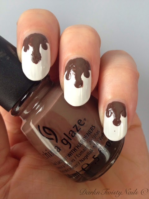 I wanted to do some kind of chocolate bar on my nails, but that just wasn't going to happen and after several failed attempt, I decided to cheer myself up with a bowl of vanilla ice cream, topped with a lot of chocolate sauce, one of my favorites! I looked at the bowl, (while stuffing my face) and suddenly I knew what I was going to do for this mani!